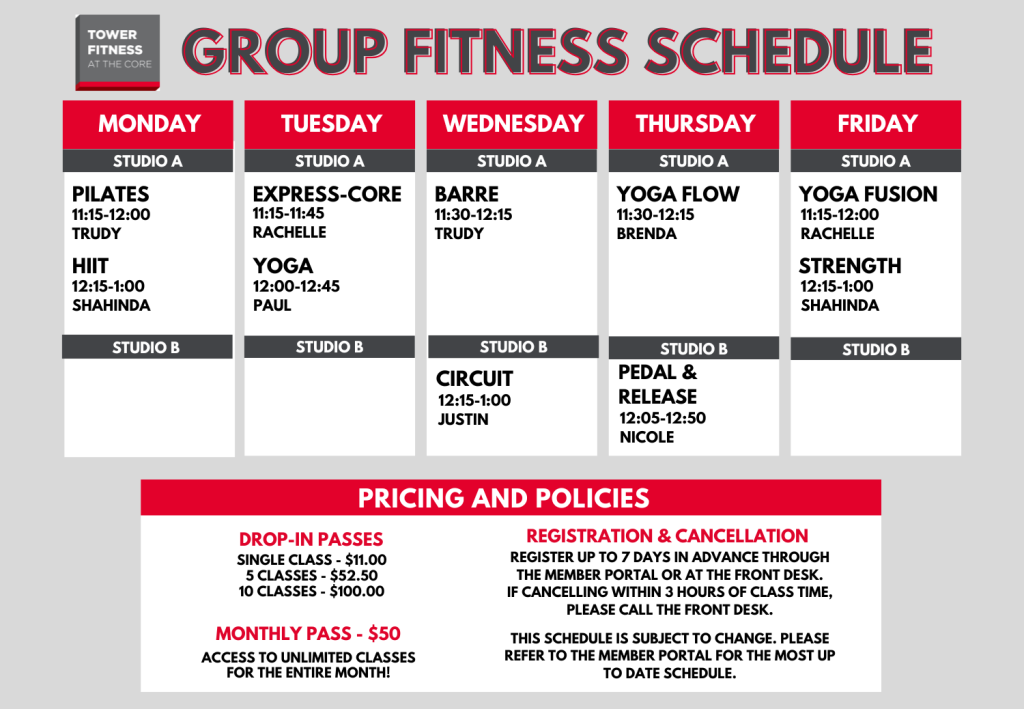 Check out the in-person class offerings below to see what fits into your schedule! You can sign up 7 days in advance through our member portal or on the Tower Fitness at the CORE app.